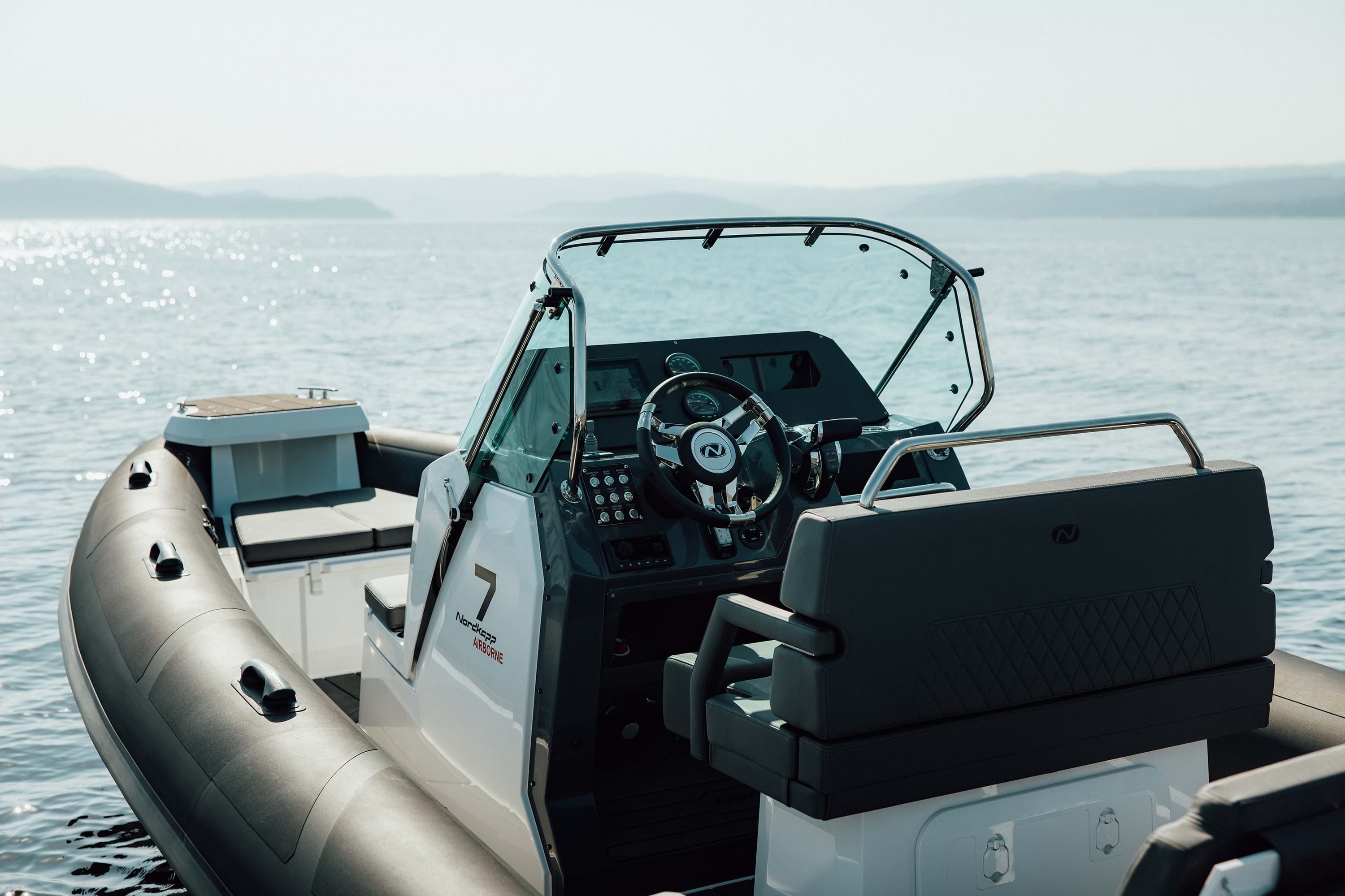 Nordkapp Airborne 7 handlar om enastående hantering och sjövärdighet. Du kommer att känna igen de exceptionella köregenskaperna från våra glasfiberbåtar och dessutom uppleva stabiliteten hos en RIB. Utöver den imponerande körförmågan erbjuder Airborne 7 eleganta lösningar som kännetecknar andra Nordkapp-båtar – med funktioner som bogpropeller, ankarspel, kylbox och Fusion-stereo är du redo för bekymmersfria dagar på vattnet.
