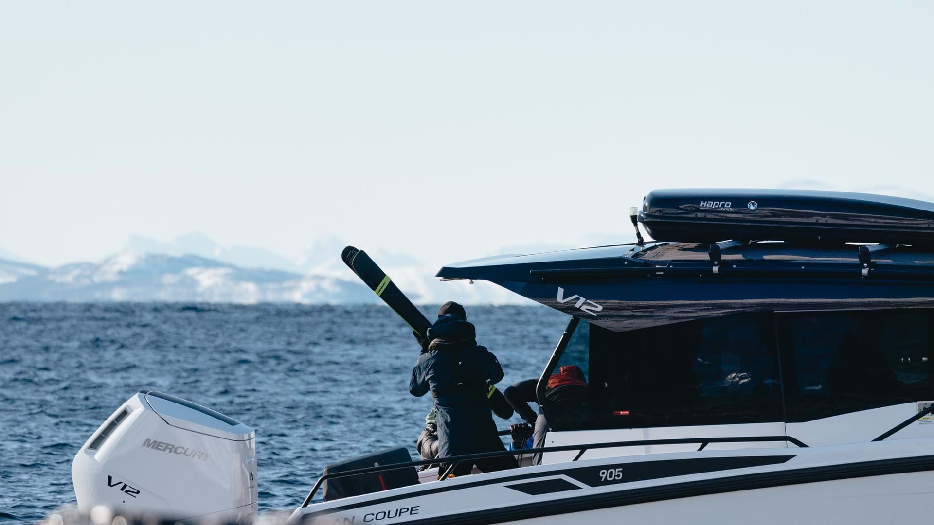 The powerful 905 V12 was the obvious choice for our adventure to the Arctic. We needed a boat that could handle a heavy toll. It would have to transport up to nine people and carry loads of equipment, all while battling snowstorms, the rugged Barents Sea and down to -25 degrees Celsius weather. Since we would transport a lot of gear and people, we first needed to adjust the boat for the trip. The team started by removing unnecessary weight, such as sunbeds, cushions, a table and things of that nature. We also needed a tender to get ashore in tricky terrain, so we added fittings for the tender boat on the aft deck. On the roof, we added a rack and a roof box to carry ski equipment for our team of nine people. This resulted in a slightly different weight distribution, but the vessel still handled the challenging Barents Sea with ease. Watch the 905 V12 tackle the Arctic in our latest feature film.