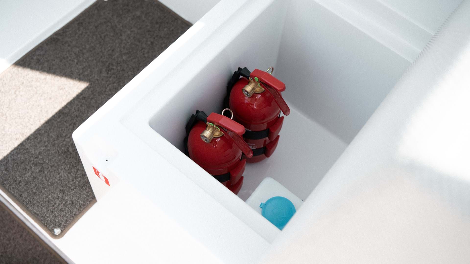 Ample storage solutions are thoughtfully integrated throughout, from the front seat designed to hold ropes to dedicated compartments for fenders, keeping everything organised and within easy reach. Foldable benches offer versatility, providing comfortable seating for guests or additional storage space when needed. Practical steps and sturdy handles on both sides of the wheelhouse ensure safe manoeuvring along the boat's exterior while docking.