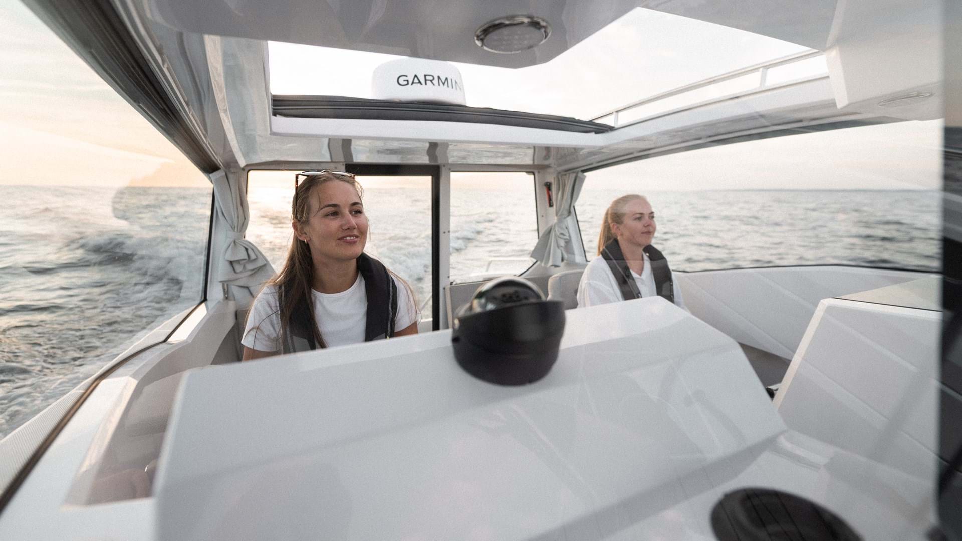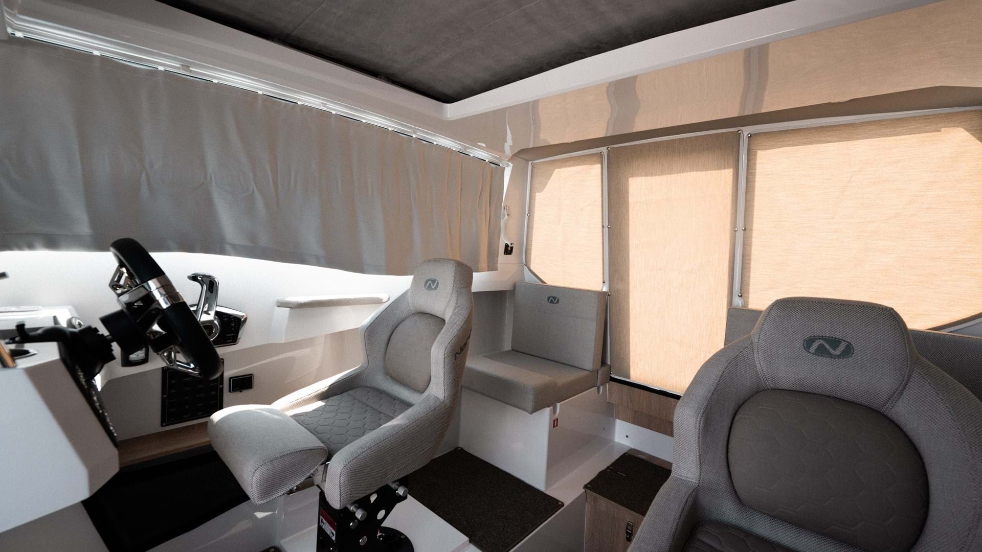 The wheelhouse features four seats, including driver and front passenger seats with shock absorption for a smooth ride. An alternative layout includes a passenger bench and a fixed driver’s seat in the wheelhouse, which gives you the option to equip a pantry for added comfort on long days at sea. The helm offers an exhilarating driving experience, combining sporty comfort with a compact layout that places a wealth of equipment within easy reach.